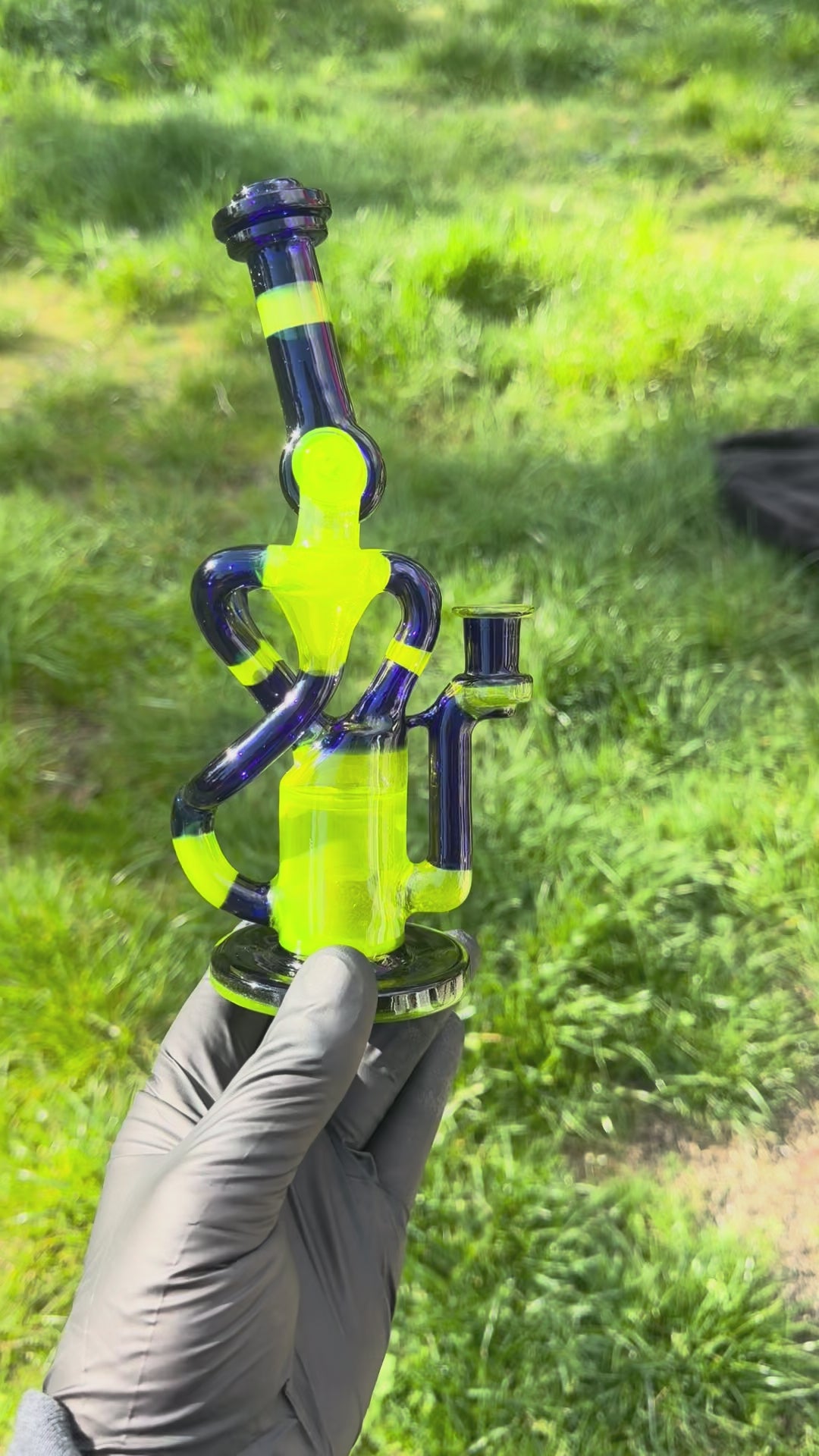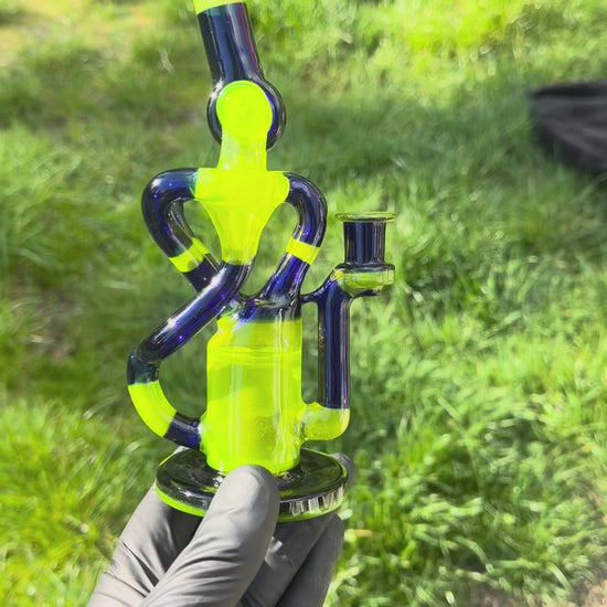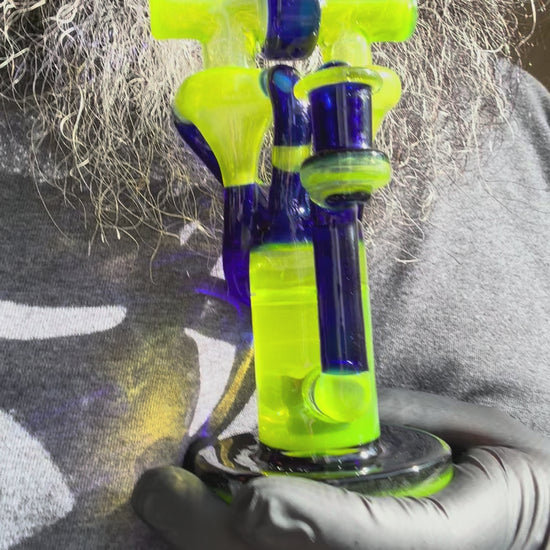 This is a hand made quad double stack recycler V3. It is comprised of 32 sections from lime drop and royal blue. It stands 8.5 inches tall with a 10mm Adapter. This new V3 has 8 total holes on the perk. 4 on each side of the perk instead of being on the top previously.
